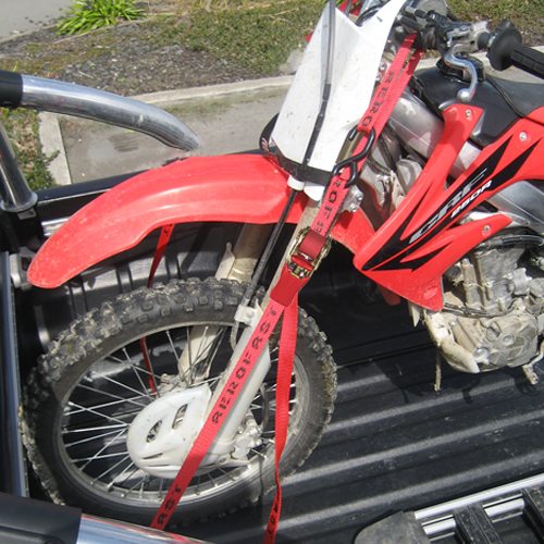 Tiedowns designed specifically for the transportation of motorcycles. Additional safety karabiner to ensure motorbike will stay secure on rough terrain. Soft-loop system to eliminate damage to bike handlebars. Heavy Duty 37mm webbing. PVC coated cambuckle to prevent damage to motorcycle’s bodywork.