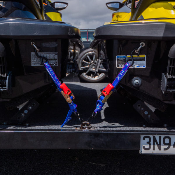 Tiedowns for securing boats to trailers at the transom / stern of the boat. Premium rubber handled ratchet. Floating hook system allows for ratchet to slide up and down to position away from the vessel to avoid and potential damage. PVC Coated S-hooks to prevent damage to body work or trailer.