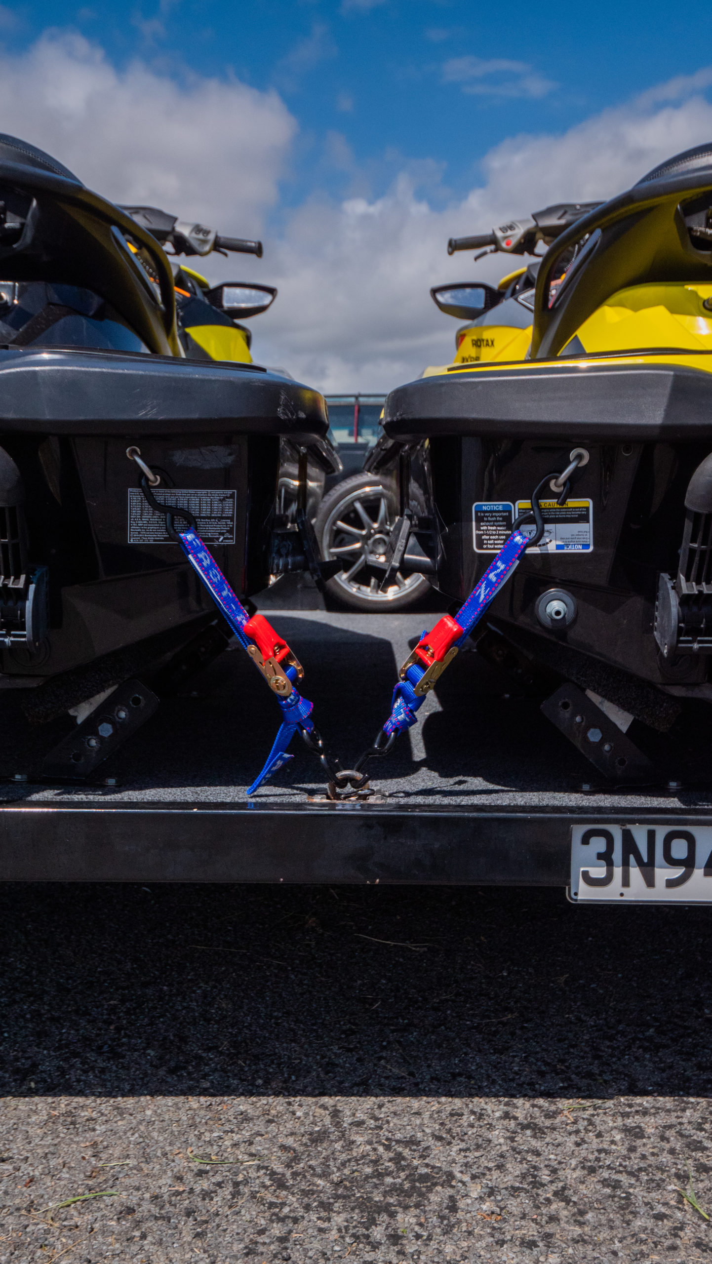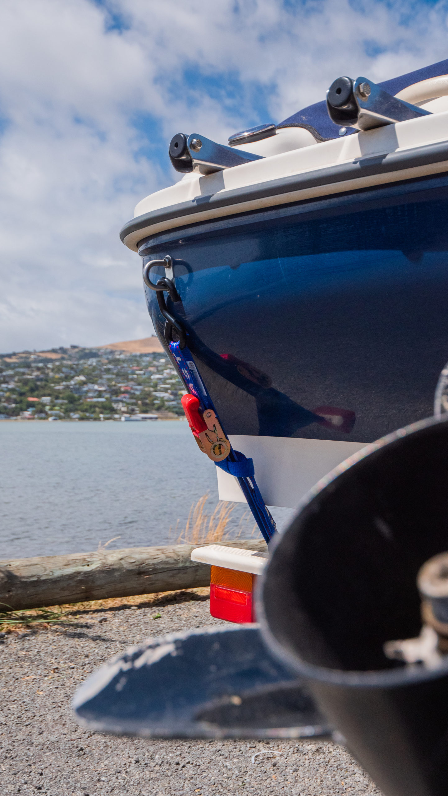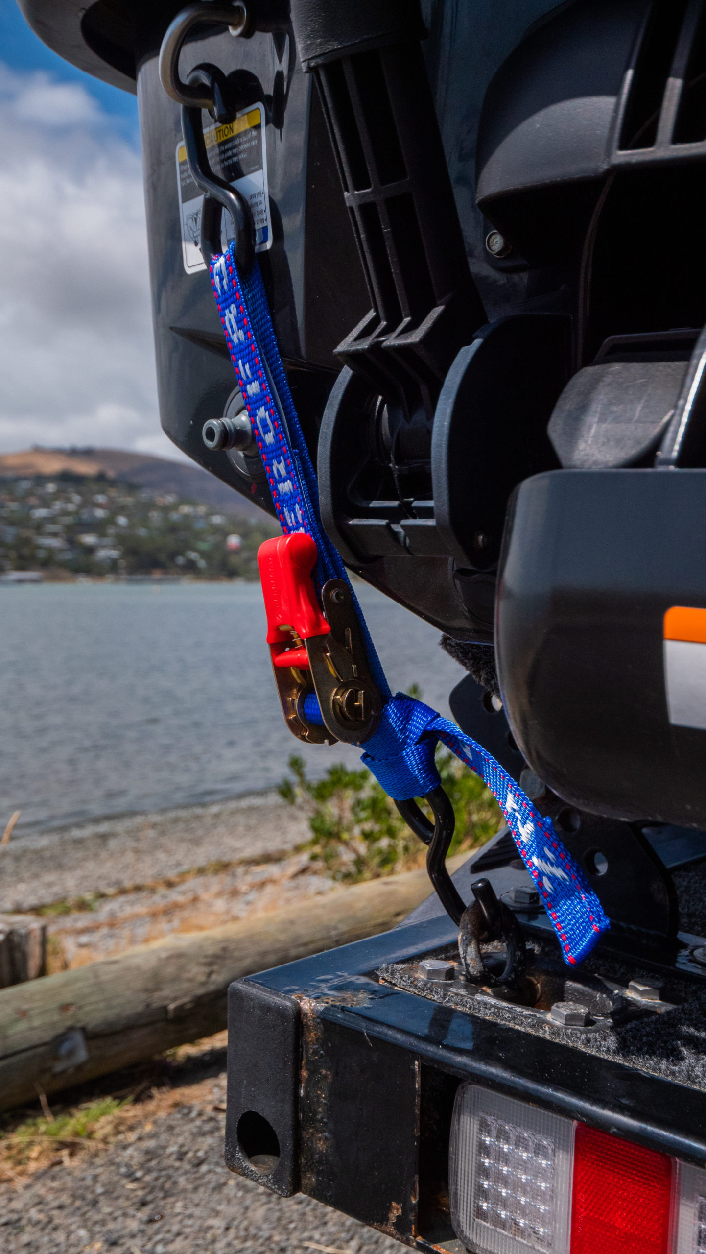 Tiedowns for securing boats to trailers at the transom / stern of the boat. Premium rubber handled ratchet. Floating hook system allows for ratchet to slide up and down to position away from the vessel to avoid and potential damage. PVC Coated S-hooks to prevent damage to body work or trailer.