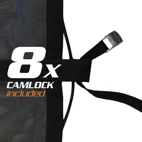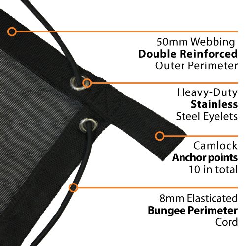 To suit 6′ x 4′ trailers (Actual size 2m x 1.5m). Heavy Duty rip resistant Cargo Net is ideal for the everyday tradesman or the weekend handyman. Fantastic for loose loads, bricks & mortar, garden waste, rough timber, general rubbish, trade tools, wood chips and much more! 10 x Tiedown anchor points, Durable rip resistant mesh fabric. 8 x Cambuckle Tiedowns. 50mm Reinforced webbing. Heavy Duty Eyelets. 8mm Perimeter bungee cord