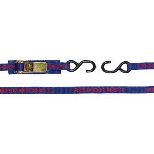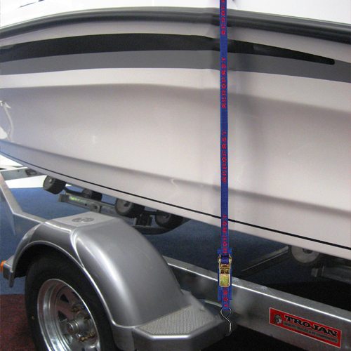 Overcentre / Gunwale tiedown for securing small boats and dinghies to trailers. Easy to use Zinc Coated Ratchet.  25mm UV-Treated Polypropylene webbing.  Rubber Protective Pad behind ratchet to prevent damage to boat. PVC Coated S-hooks to prevent damage to body work or trailer.