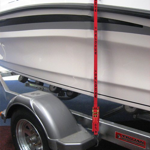 Overcentre / Gunwale tiedown for securing medium sized boats to trailers. Easy to use rubber coated ratchet. 25mm Heavy Duty UV-Treated Polypropylene webbing for durability and added strength. Protective webbing behind ratchet to prevent damage to boat. PVC Coated S-hooks to prevent damage to body work or trailer.
