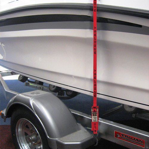 Overcentre / Gunwale tiedown for securing medium sized boats to trailers. Easy to use stainless steel (304) ratchet for added product life.  25mm Heavy Duty UV-Treated Polypropylene webbing for durability and added strength. Protective webbing behind ratchet to prevent damage to boat. PVC Coated S-hooks to prevent damage to body work or trailer.