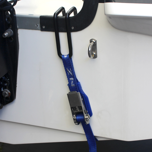Tiedowns for securing boats to trailers at the transom / stern of the boat. Stainless Steel ratchet for extended life. Rubber Protective Pad behind ratchet to prevent damage to boat. PVC Coated Transom hook which attaches to the stern of the boat. PVC Coated S-hook to prevent damage to body work or trailer.