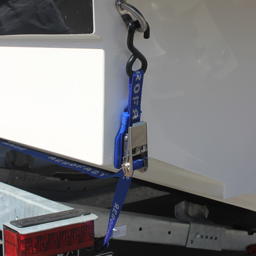 Tiedowns for securing boats to trailers at the transom / stern of the boat. Stainless steel ratchet for extended life. Rubber Protective Pad behind ratchet to prevent damage to boat. PVC Coated S-hooks to prevent damage to bodywork or trailer.